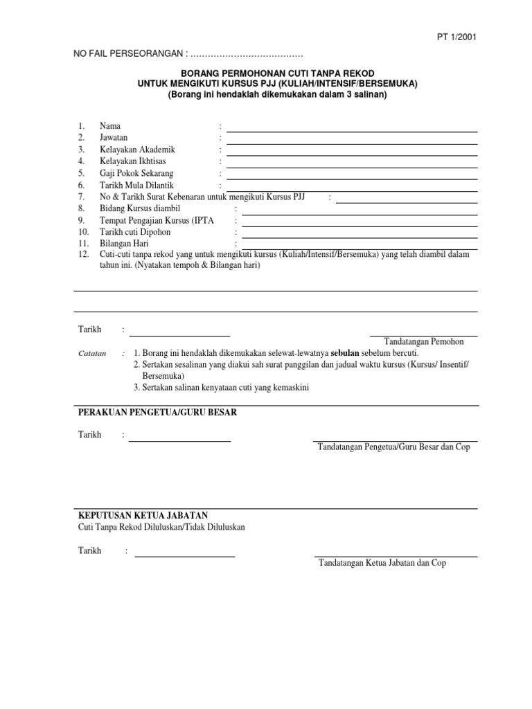 Borang Permohonan Cuti Tanpa Rekod Borang Kemas Kini Feb 2018 Pdf