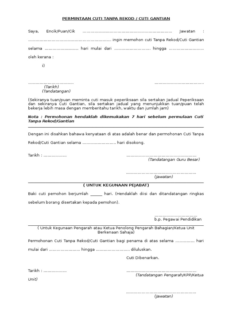 Jadual Faedah Gantian Cuti Rehat. Sebarang cuti yang melebihi kelayakan hendaklah ditolak dari Cuti Rehat. BORANG PERMOHONAN CUTI TIDAK BERGAJI CTG Terkini Julai 2021 falsefalse1.
